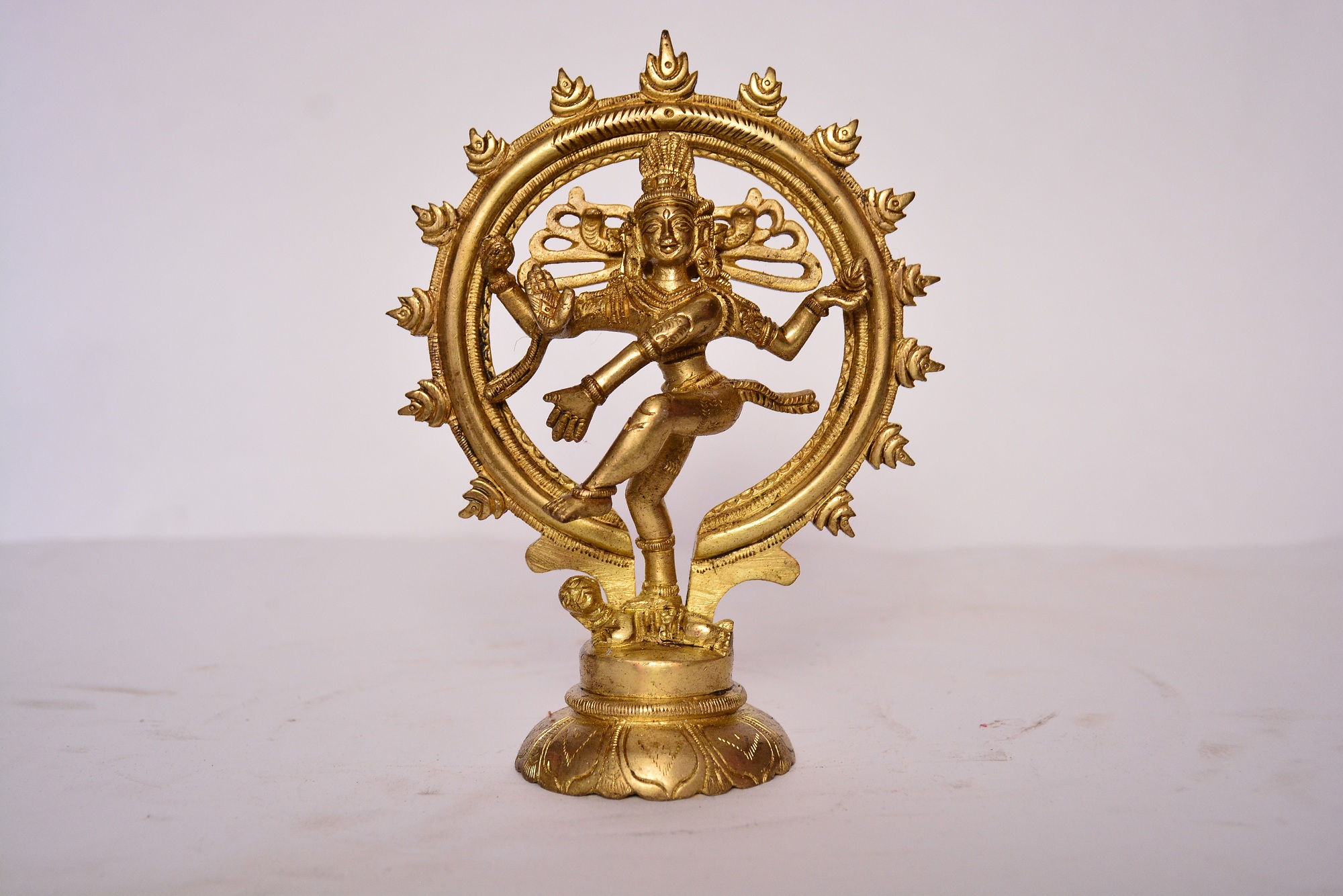 | In a marvelously unified and dynamic composition expressing the rhythm and harmony of life, Nataraj is shown with four hands represent the cardinal directions. He is dancing, with his left foot elegantly raised and the right foot on a prostrate figure—’Apasmara Purusha’, the personification of illusion and ignorance over whom Shiva triumphs. The upper left-hand holds a flame, the lower left-hand points down to the dwarf, who is shown holding a cobra. |